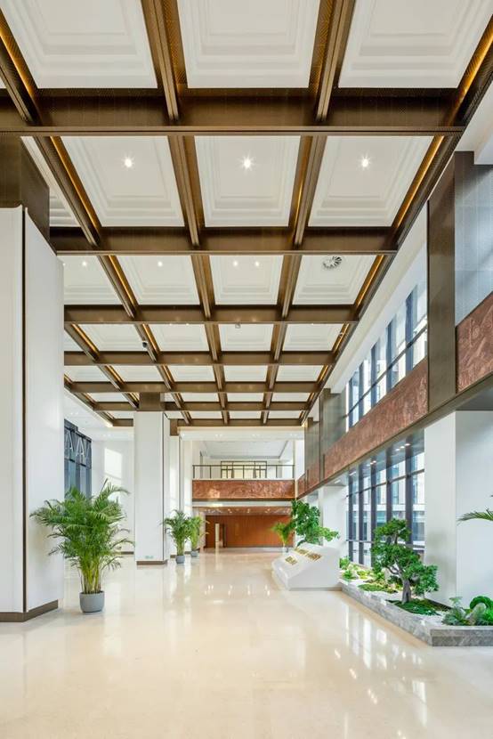 中央大厅作为公众进入法庭的主要入口,是设计的重点区域,金螳螂设计团队用对称式布局 天堂影院,体现“廉洁公正,司法为民的”设计初心,顶部以敦煌石窟艺术“回”字藻井为灵感来源,细节处采用铜板蚀刻的麦穗纹样装饰,麦穗是法徽的重要组成部分,代表着广大的人民群众,柱体的弧形面装饰,形似“简”,中心景观运用造景手法,用山水体现中国气韵,营造出自然的气息。