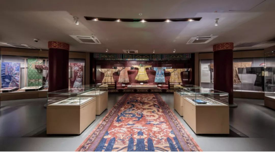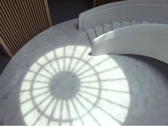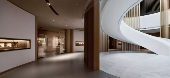 中国丝绸博物馆丝路馆从传统丝绸的制作工具“织机”中提取设计灵感,将“丝线”通过穿插、阵列、旋转、复制,为展厅中庭构建出极富建筑感的艺术形态。从顶面延伸下来的丝线,自然形成环廊与中庭的隔断,使得空间语汇完整而凝练。中庭顶部圆形天窗洒落的光线随着一天内时间的推移发生微妙的变化,行走其中如穿梭历史的回廊。