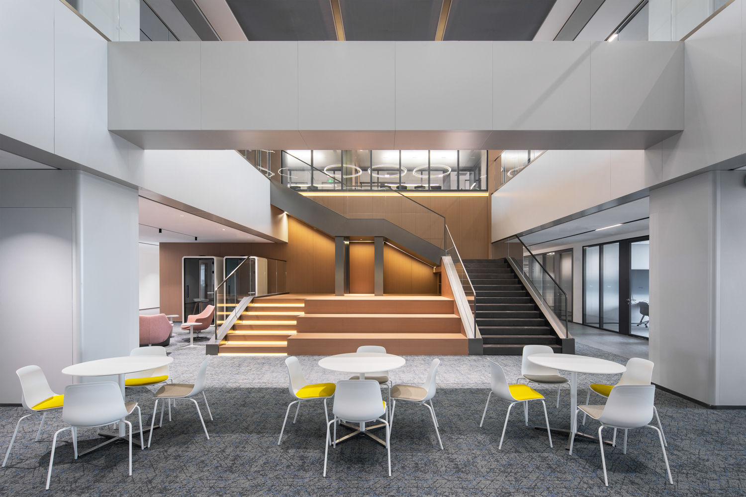 金螳螂承接了长飞先进武汉基地地下两层与地上七层的室内精装修工程,总施工面积达30000m²,涵盖共享办公区 天堂视频高清,访客大厅,会议空间,餐厅及公共区域等,在这里,设计美学与文化内涵深度融合,成为了科技与人文交织的创新典范。